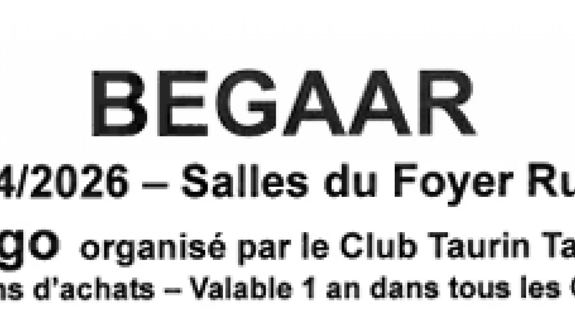 Accueil Bégaar Vivre à Bégaar Les actus de Bégaar Loto/Bingo organisé par le Club TAURIN Samedi 25 avril 2026 à 20h30 Loto/Bingo organisé par le Club TAURIN Publié le 13 avril 2026 / Dernière modification le 13 avril 2026 Loto/Bingo organisé par le Club TAURIN Publié le 13/04/2026 - Dernière modification le 13/04/2026